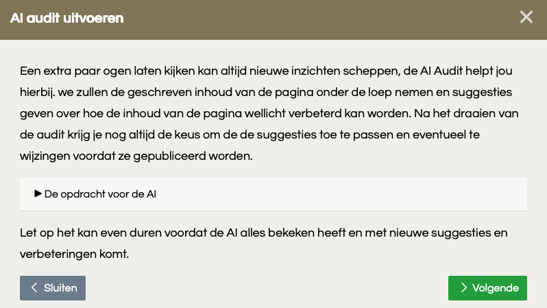De module kun je gebruiken door onder "huidige pagina" op "AI audit uitvoeren" te drukken. Dit laat een pop-up zien waarmee je de stappen voor de audit kan doorlopen.