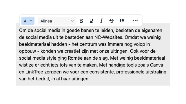 Onze AI-gestuurde tekstbewerkingsïntegratie in de website, biedt een efficiënte oplossing om tekstuele content te verbeteren. Deze technologie biedt de mogelijkheid om teksten te verbeteren op de volgende facetten: